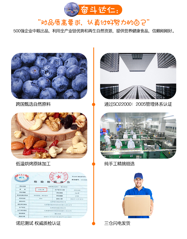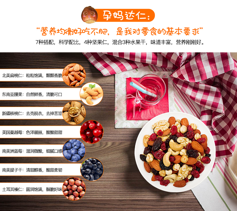 配料表:扁桃仁 腰果 核桃仁 榛子仁 藍(lán)莓干 蔓越莓干 紅提干