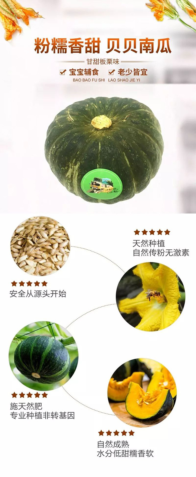 貝貝南瓜營養(yǎng)成分遠(yuǎn)超國產(chǎn)大南瓜,其中干物質(zhì)含量極高,非還原糖和淀粉含量高,淀粉與全糖比率大于1,蛋白質(zhì)高,纖維較少,維生素A、C含量高,是很好的保健食品。南瓜果肉內(nèi)有一種特殊物質(zhì),可促進(jìn)胰島素分泌,降低血糖水平,對(duì)防治糖尿病有特效。