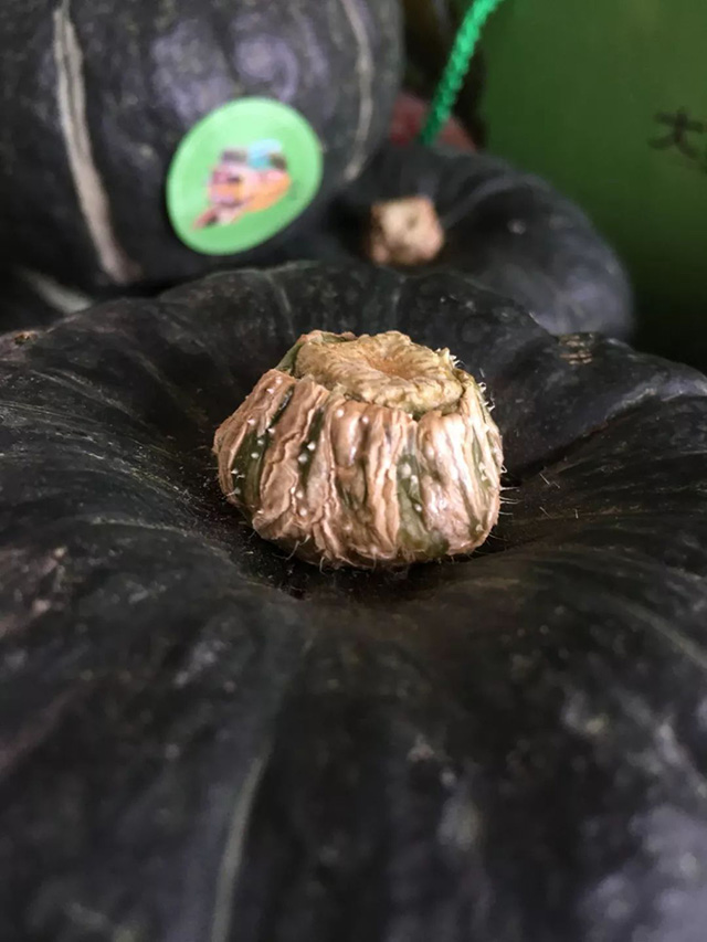 老南瓜的瓜蒂有縱向的自然皴裂,這樣的南瓜就是在蔓上老的瓜。嫩瓜即便是放老,瓜蒂只會(huì)干癟但不會(huì)有縱向自然皴裂。(如圖,明顯的縱向裂紋)