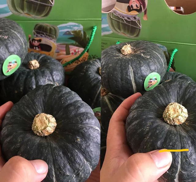 用指甲朝南瓜的外皮稍稍用力一掐,老南瓜外皮比較堅(jiān)硬緊實(shí)。如果南瓜皮一掐就破,就證明成熟度不夠,是嫩瓜,很難掐入或無法掐入則證明是老瓜,這樣的瓜可放心選購(如圖,只掐出印,但無法掐入)