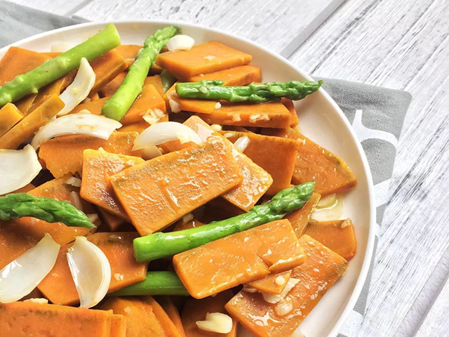 1、百合掰開洗干凈,蘆筍切段,南瓜去皮去瓤切薄片