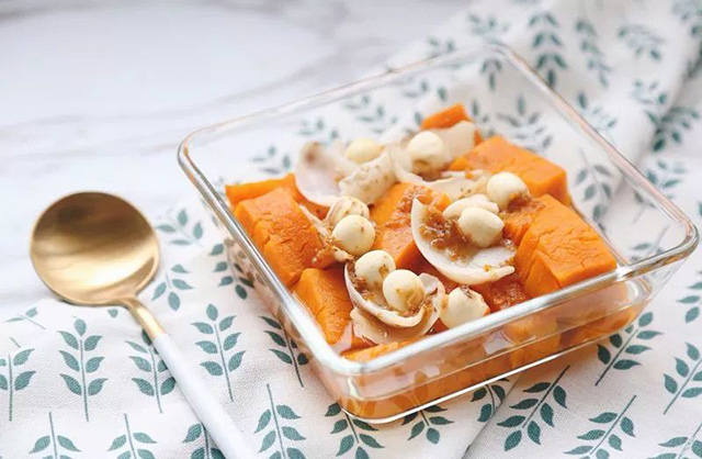 蓮子10顆,百合10塊,面粉150克,南瓜1大塊,糖桂花3勺