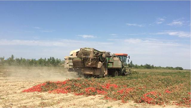 成千上萬畝的番茄地 ,這里的番茄均為機(jī)器采摘,采摘機(jī)器可以智能分辨出成熟的番茄和未成熟的綠色番茄。機(jī)器從番茄地里一掃而過,綠色的番茄會(huì)被過濾在地上。 只有果皮完整、色澤飽滿的,才能被留下來。