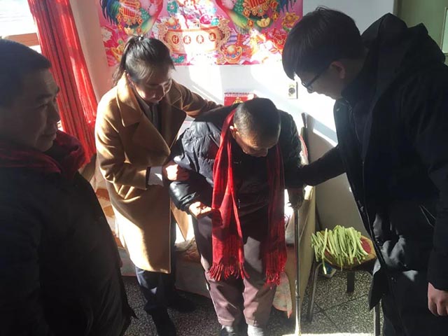 鐘東兵叔叔今年58歲,天生患有小兒麻痹癥,行動不便。生活來源沒有保障,在村委會喬主任的帶領(lǐng)下中宜國糧與龍?zhí)堵放沙鏊黄饋砜赐迨灏⒁蹋o叔叔阿姨帶來了新春禮物。