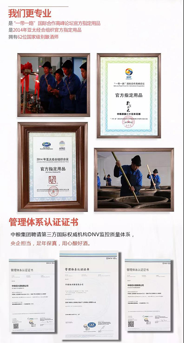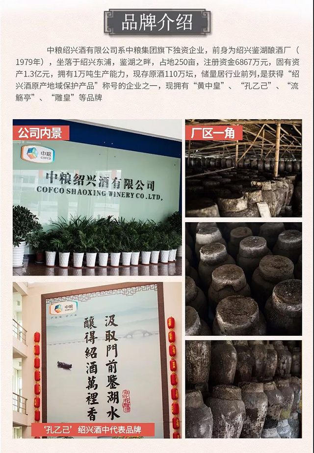 中糧紹興酒有限公司系中糧集團(tuán)下轄的獨(dú)資企業(yè),前生為紹興鑒湖糧酒廠(1979年),坐落于紹興東浦,鑒湖之畔,占地250畝,注冊(cè)資金6867萬(wàn)元,固定資產(chǎn)1.3億元,擁有1萬(wàn)噸生產(chǎn)能力。現(xiàn)存原酒110萬(wàn)壇,儲(chǔ)酒量居行業(yè)前列,是首批獲得“紹興酒原產(chǎn)地域保護(hù)產(chǎn)品”稱號(hào)的企業(yè)之一,現(xiàn)擁有“黃中皇”、“孔乙己”、“流觴亭”、“雕黃”等品牌。