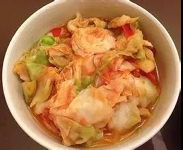 1、先將番茄用開水稍燙,去皮切塊;圓白菜洗凈切片;