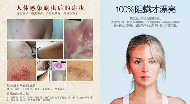 螨蟲及分泌物會堵塞毛孔,使角質(zhì)變厚、皮膚變得粗糙,并引發(fā)痘痘、痤瘡等皮膚;此外還會加速細小皺紋的產(chǎn)生以及各種斑點色素沉著。