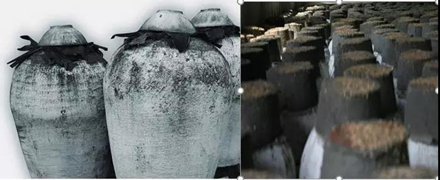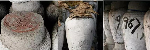 酒入壇后,先用滅菌的干荷葉封口,后用陶制的瓦蓋扣住荷葉封口,再用箬殼裹住蓋,并以竹絲扎緊,最后才用封泥涂抹密封。封泥是用粘土,谷殼等拌和而成。最后再用石灰滿壇罩刷一遍。更講究的還在封頭里壓進(jìn)酒坊的坊單,也就是如今的說明書了。