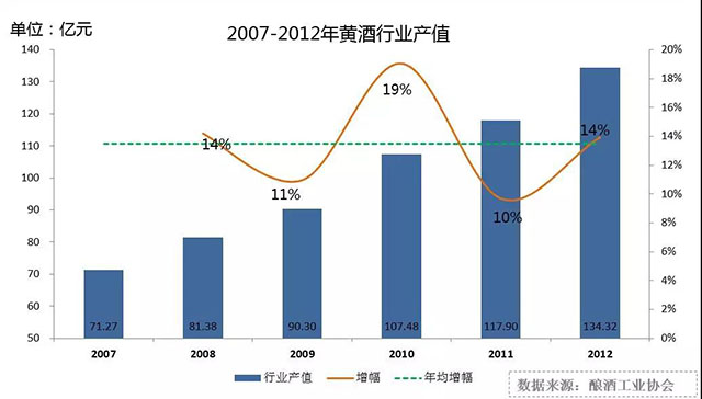2007-2012年黃酒行業(yè)收入符合成長(zhǎng)率約13.5%。增長(zhǎng)得益于宏觀經(jīng)濟(jì)增長(zhǎng),紹興黃酒外擴(kuò)努力,新派黃酒營銷發(fā)力等因素。