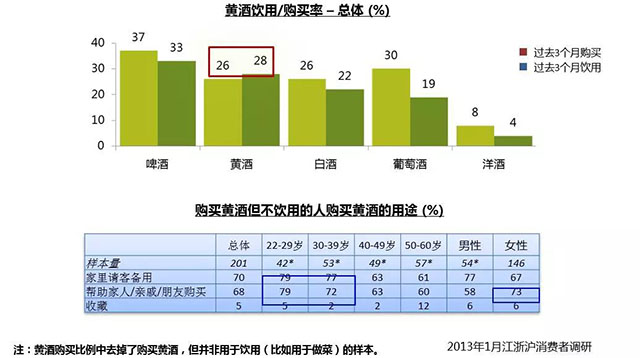 消費(fèi)者過去3個(gè)月的黃酒購買比例為28%,飲用比例為26%,在測(cè)試的五類酒精產(chǎn)品中國普及率僅次于啤酒,領(lǐng)先于白酒、葡萄酒和洋酒。黃酒購買率比例略高于飲用比例,原因是部分消費(fèi)者,特別是22-39歲的年輕消費(fèi)者是為家人和朋友購買。