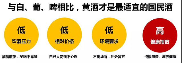 黃酒特點(diǎn):低度、爽口、價(jià)格適中、適宜任何場(chǎng)所飲用,加冰、溫飲及加輔飲(紅茶)均可。與白酒相比,飲酒壓力小,低糧耗,食品安全有保障;與葡萄酒相比,性價(jià)比高,歲場(chǎng)所,場(chǎng)合要求低;與啤酒比,消費(fèi)季長(zhǎng),飲食搭配無顧忌。