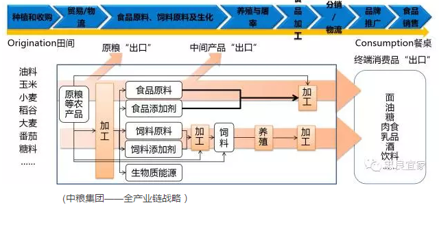 中糧集團(tuán)的產(chǎn)業(yè)鏈覆蓋了從田間到餐桌的各個(gè)環(huán)節(jié)。這意味著從農(nóng)產(chǎn)品原料到最終食品銷售的全部步驟——種植、收割、倉儲(chǔ)、貿(mào)易、養(yǎng)殖、屠宰、加工和銷售,中糧集團(tuán)強(qiáng)大的系統(tǒng)將各個(gè)環(huán)節(jié)有效地組織在一起。