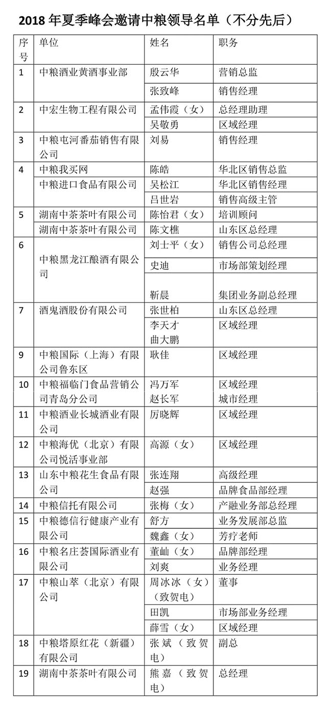 2018年8月2日至4日,中宜國(guó)糧2018年半年度峰會(huì)于煙臺(tái)5A級(jí)旅游風(fēng)景區(qū)南山圓滿舉辦,本次會(huì)議邀請(qǐng)了中糧集團(tuán)各版塊領(lǐng)導(dǎo)參與晚宴及第二天的培訓(xùn),嘉賓列名如下: