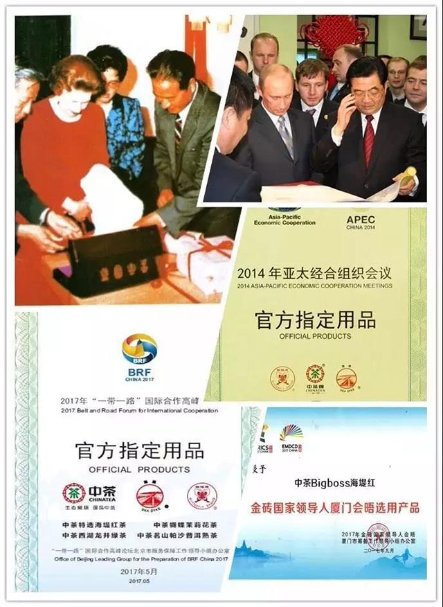 茶是中國與世界相知相交的重要媒介,中國茶在外交舞臺上魅力頻頻展現(xiàn)。1980年起,中茶產(chǎn)品就開始做為國禮贈與各國政要,傳播中國茶文化,惠及世界人民。1980年,中茶產(chǎn)品作為國禮贈與伊麗莎白女王;2007年,中茶產(chǎn)品作為國禮贈與俄羅斯總統(tǒng)普京;2014年,中茶產(chǎn)品作為APEC會議的官方指定用品,供世界各國元首品飲;2017年,中茶產(chǎn)品成為 “一帶一路”國際合作高峰論壇的官方指定用品,中茶再次享譽世界;同年,中茶產(chǎn)品作為廈門金磚會議官方伴手禮,再次贈與世界各國友人,代表中國款待世界……